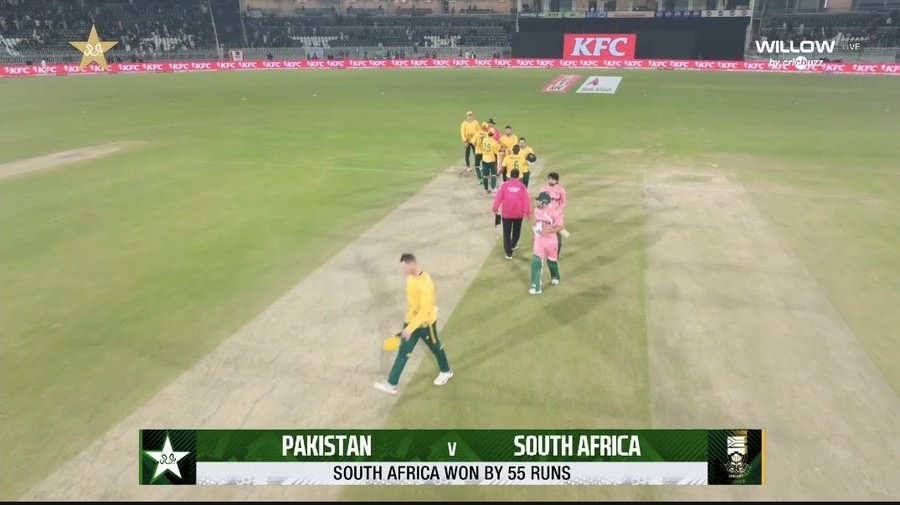 - Pakistan’s chase quickly went off track: they lost early wickets, including the top order, and ultimately were bowled out for 139 (or thereabouts) in 18.1 overs. South Africa won by about 55 runs.