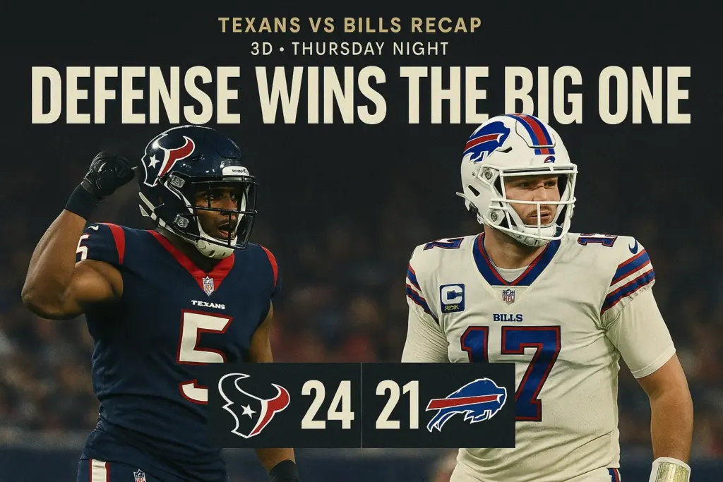 In a high-energy Thursday Night Football matchup, the Houston Texans defeated the Buffalo Bills 23-19, led by a dominant defensive performance. With eight sacks, multiple turnovers, and a game-saving late stand, the Texans proved that their defense is becoming one of the NFL’s most dangerous units.